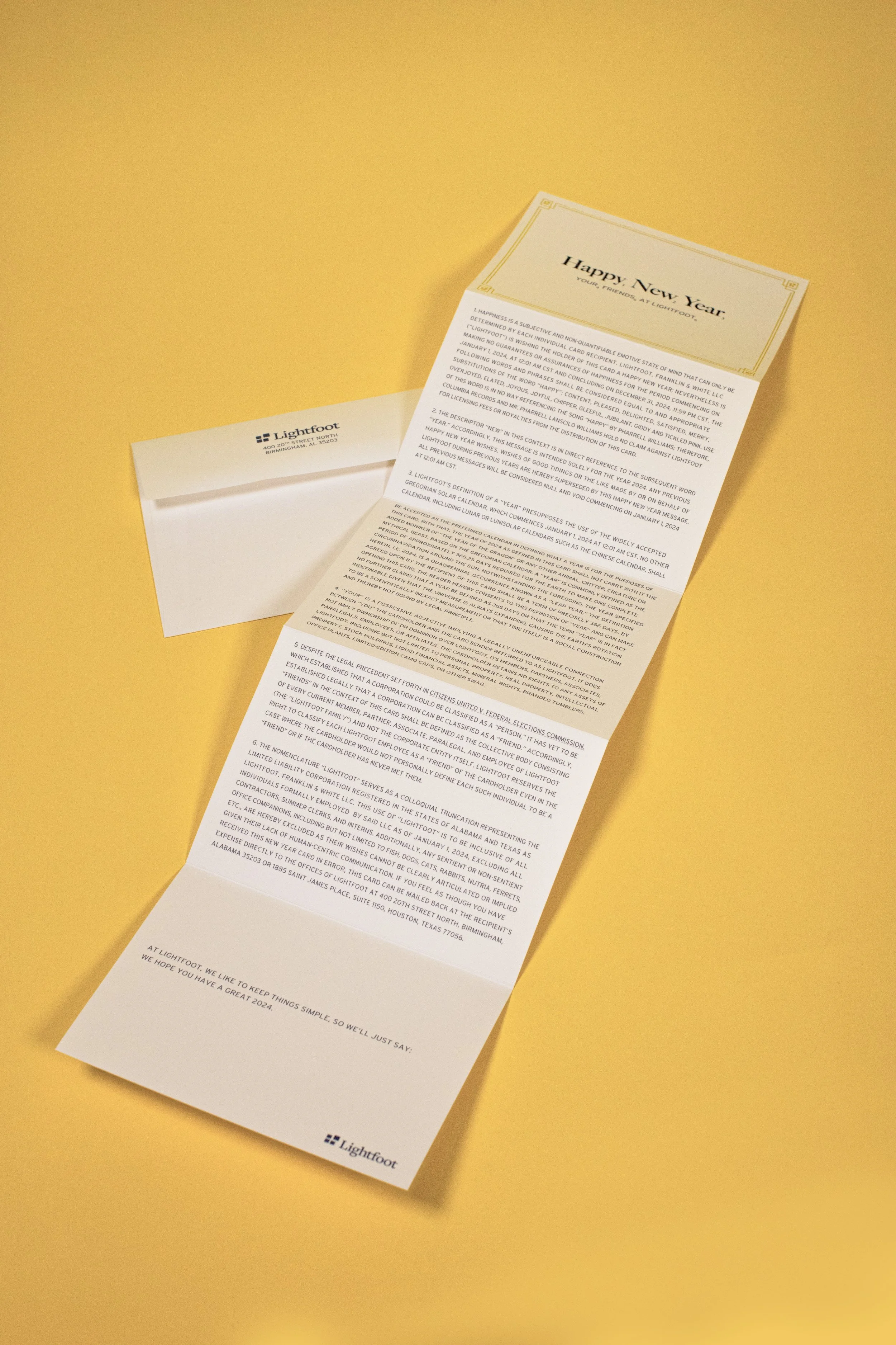 6 The nomenclature “Lightfoot” serves as a colloquial truncation representing the limited liability corporation registered in the states of Alabama and Texas as Lightfoot, Franklin & White LLC. This use of “Lightfoot” is to be inclusive of all individuals formally employed on a full-time basis by said LLC as of January 1, 2024, excluding all subcontractors, part-time employees, and interns. Additionally, any sentient or non-sentient office companions, including but not limited to fish, dogs, cats, rabbits, nutria, ferrets, et al., are hereby excluded as their wishes cannot be clearly articulated or implied given their lack of human-centric communication. If you feel as though you have received this New Year card in error, this card can be mailed back at the recipient’s expense directly to the offices of Lightfoot, Franklin & White LLC at 400 20th Street North, Birmingham, Alabama 35203 or 1885 Saint James Place, Suite 1150, Houston, Texas 77056.